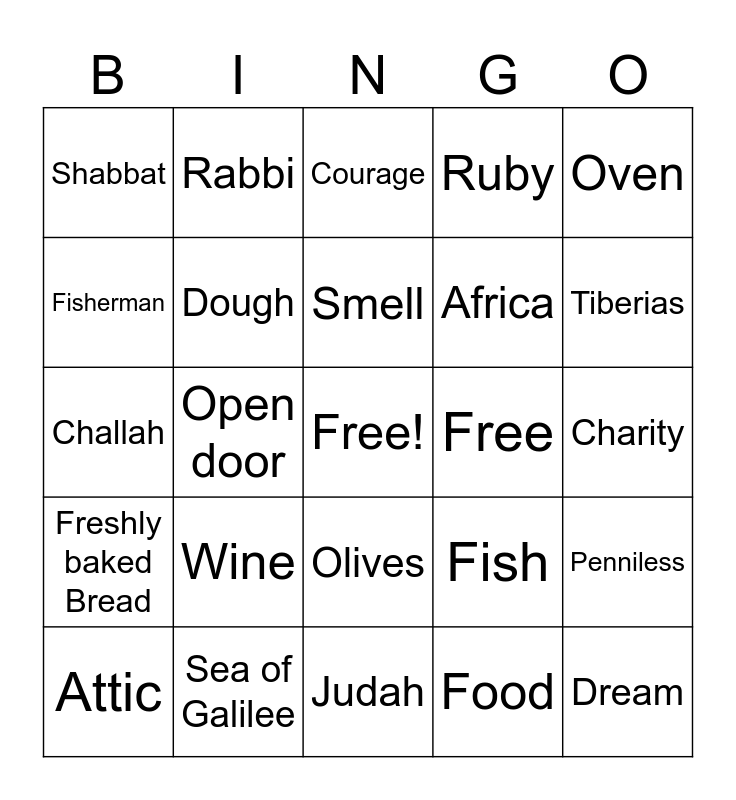 This bingo card has a free space and 34 words: Peddler, Food, Happy, Baker, Freshly baked Bread, Dough, Oven, Attic, Rabbi, Heart sank, Smell, Courage, Coins, Golden bells, Free, Tiberias, Sea of Galilee, Challah, Wine, Fish, Olives, Friday Night, Shabbat, Charity, Judah, Dream, Ruby, Caesarea, Africa, Fisherman, Friendship, Open door, Penniless and Joseph.
