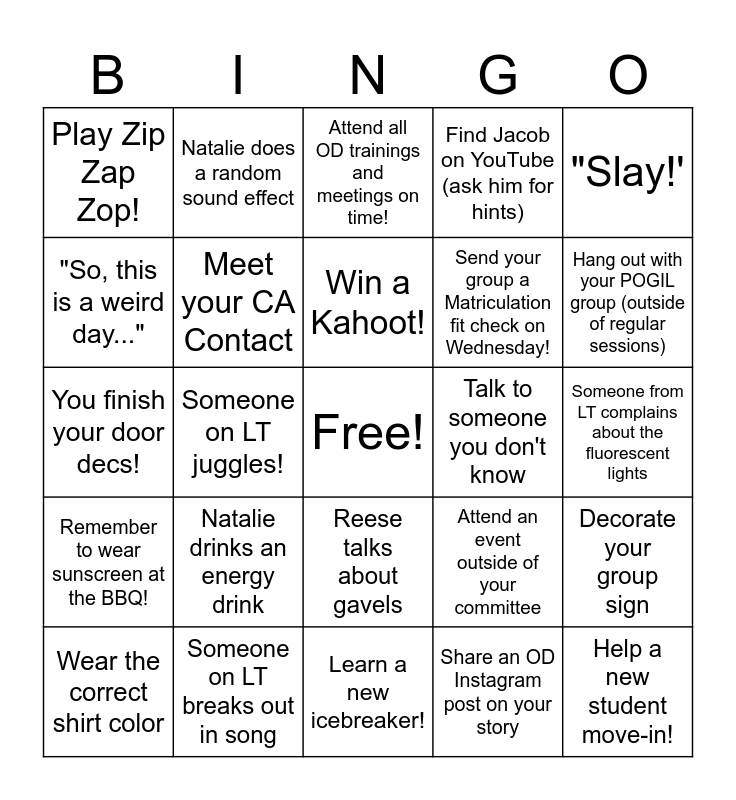 This bingo card has a free space and 24 words: Natalie drinks an energy drink, Someone on LT breaks out in song, Win a Kahoot!, Wear the correct shirt color, "Slay!', Play Zip Zap Zop!, "So, this is a weird day...", Natalie does a random sound effect, Talk to someone you don't know, Reese talks about gavels, Send your group a Matriculation fit check on Wednesday!, You finish your door decs!, Attend an event outside of your committee, Decorate your group sign, Meet your CA Contact, Share an OD Instagram post on your story, Someone from LT complains about the fluorescent lights, Attend all OD trainings and meetings on time!, Hang out with your POGIL group (outside of regular sessions), Someone on LT juggles!, Help a new student move-in!, Remember to wear sunscreen at the BBQ!, Find Jacob on YouTube (ask him for hints) and Learn a new icebreaker!.
