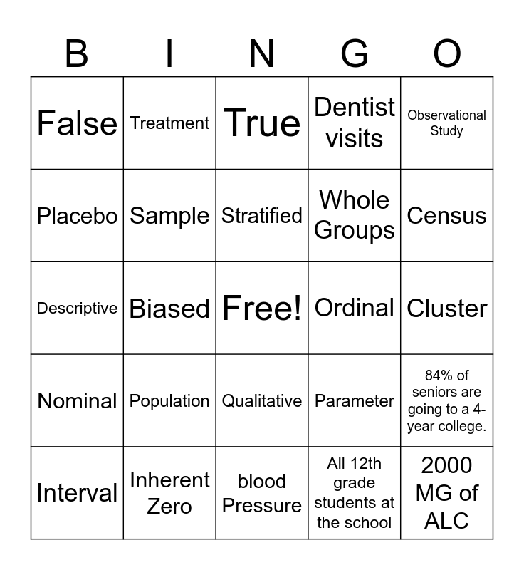 This bingo card has a free space and 33 words: Inferential, Simple Random, Biased, Quantitative, Nominal, Sample, Observational Study, Interval, Treatment, Statistic, Stratified, True, Systematic, Experimental Study, Ordinal, Census, Inherent Zero, Descriptive, Population, Parameter, Qualitative, Ratio, False, Cluster, blood Pressure, 2000 MG of ALC, Dentist visits, Whole Groups, Placebo, 84% of seniors are going to a 4-year college., Most seniors are going to a 4 year college, All 12th grade students at the school and the 1200 12th grade students who took the survey.