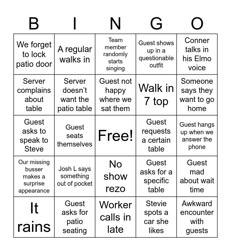 This bingo card has a free space and 24 words: Josh L says something out of pocket, Guest asks for patio seating, Guest not happy where we sat them, It rains, Conner talks in his Elmo voice, We forget to lock patio door, Server complains about table, A regular walks in, Guest requests a certain table, No show rezo, Walk in 7 top, Guest asks to speak to Steve, Guest asks for a specific table, Guest mad about wait time, Server doesn’t want the patio table, Stevie spots a car she likes, Guest hangs up when we answer the phone, Team member randomly starts singing, Someone says they want to go home, Guest seats themselves, Awkward encounter with guests, Our missing busser makes a surprise appearance, Guest shows up in a questionable outfit and Worker calls in late.