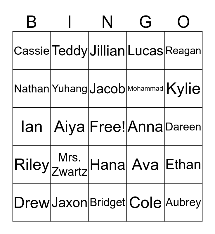 This bingo card has a free space and 24 words: Mrs. Zwartz, Jaxon, Jacob, Drew, Reagan, Cassie, Nathan, Teddy, Anna, Hana, Mohammad, Ian, Ava, Ethan, Yuhang, Cole, Dareen, Jillian, Kylie, Aiya, Aubrey, Riley, Lucas and Bridget.