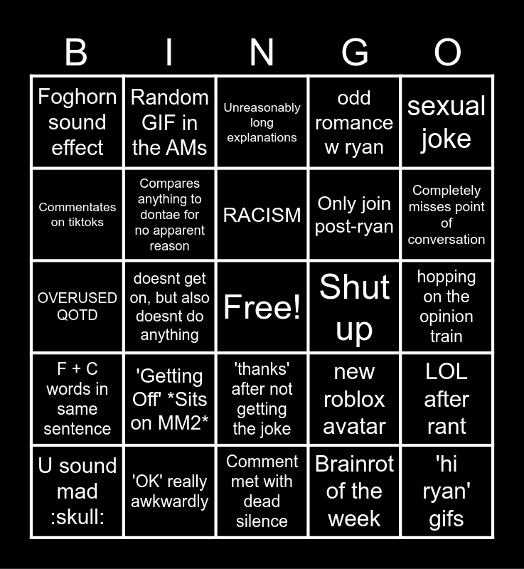 This bingo card has a free space and 28 words: LOL after rant, Dontae w/o context, Only join post-ryan, Brainrot of the week, Commentates on tiktoks, Unreasonably long explanations, Random GIF in the AMs, F + C words in same sentence, Shut up, U sound mad :skull:, OVERUSED QOTD, odd romance w ryan, 'OK' really awkwardly, Comment met with dead silence, Completely misses point of conversation, Toxic on Roblox, 'Getting Off' *Sits on MM2*, Compares anything to dontae for no apparent reason, RACISM, 'thanks' after not getting the joke, Foghorn sound effect, Mocking nerd accent, 'hi ryan' gifs, doesnt get on, but also doesnt do anything, hopping on the opinion train, new roblox avatar, sexual joke and ONGGG BROOOO.