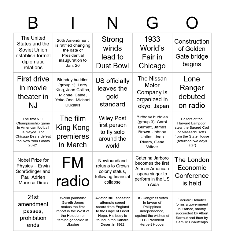 This bingo card has 70 words: FDR unveils the Civil Works Administration, designed to create jobs for more than 4 million of the unemployed, Editors of the Harvard Lampoon steal the Sacred Cod of Massachusetts from the State House (returned two days later), The first flight over Mount Everest is made by the British Houston-Mount Everest Flight Expedition, Japan Precision Optical Industry, predecessor Canon is founded in Japan, Welsh journalist Gareth Jones makes the first report in the West of the Holodomor famine genocide in Ukraine, Francis Perkins, first women to sit in the Cabinet Labor Secretary, 1933 World’s Fair in Chicago, The first alleged modern sighting of the Loch Ness Monster occurs, Construction of Golden Gate bridge begins, Worst year of depression, over 25% unemployment, The London Economic Conference is held, Calvin Coolidge dies, The United States and the Soviet Union establish formal diplomatic relations, Strong winds lead to Dust Bowl, First minimum wage law establishes 33 cents/hr, The film King Kong premieres in March, Newfoundland returns to Crown colony status, following financial collapse, The Nissan Motor Company is organized in Tokyo, Japan, The London Passenger Transport Board begins operation, Nobel Prize for Physics – Erwin Schrödinger and Paul Adrien Maurice Dirac, Birthday buddies (group 3): Carol Burnett, James Brown, Johnny Unitas, Joan Rivers, Gene Wilder, Caterina Jarboro becomes the first African American opera singer to perform in the US in Aida, Lone Ranger debuted on radio, Popular song “We’re In The Money” and “Who’s Afraid of the Big Bad Wolf?”, On March 13, the Dow rose over 15% from 53.84 to 65.10, The International Court of Justice in The Hague decides that Greenland belongs to Denmark, condemns Norwegian landings, FDIC created, Nobel Prize for Literature – Ivan Bunin, US Congress votes in favour of Philippines independence, against the wishes of U.S. President Herbert Hoover, First baseball All Star Game is played at Comiskey Park as part of the World’s Fair, 20th Amendment is ratified changing the date of Presidential inauguration to Jan. 20, Toll House Cookies invented, The year MCMXXXIII, "Machine Gun Kelly" and Albert Bates kidnap Charles Urschel, an Oklahoma oilman, and demand $200,000 ransom, American aviator Jimmie Angel becomes the first foreigner to see the Angel Falls in Venezuela, Average price of a movie was 25 cents, Nobel Prize for Physiology or Medicine – Thomas Hunt Morgan, Member of the English cricket team touring New Zealand, batsman Wally Hammond, scores a record 336 runs in a test match, Machine gun demonstrated in Japan 1,000 shots per minute, First drive in movie theater in NJ, Édouard Daladier forms a government in France, shortly succeeded by Albert Sarraut and then by Camille Chautemps, FM radio, Wiley Post first person to fly solo around the world, The Adélaïde Concerto attributed to Wolfgang Amadeus Mozart, actually composed by Marius Casadesus, First singing telegram was delivered to Rudy Valle in NY, Birthday buddies (group 1): Larry King, Joan Collins, Michael Caine, Yoko Ono, Michael Dukakis, 21st amendment passes, prohibition ends, Einstein immigrates to US, Kit Kat candy bar invented, Joe DiMaggio’s 61 game hitting streak ends in July, In October, Babe Ruth makes his final pitching performance pitching all 9 innings, Adolf Hitler became chancellor of Germany, Nobel Prize for Peace – Sir Norman Angell (Ralph Lane), Long Beach earthquake shakes Southern California with a maximum Mercalli intensity of VIII, Aviator Bill Lancaster attempts speed record from England to the Cape of Good Hope. His body is found in the Sahara Desert in 1962, Coit Tower is dedicated to SF firefighters, US officially leaves the gold standard, Civilian Conservation Corps created, Miracle Whip by Kraft, First issue of Newsweek, The first NFL Championship game in American football is played. The Chicago Bears defeat the New York Giants 23-21, Radio Telescope invented - Karl Jansky, First of fireside chats begin in March, Opened Dachau as first concentration camp, Smedley Butler becomes involved in a coup attempt led by Gerald MacGuire against the president (FDR) which fails, Average cost of a new home $5,750, Haifa harbor opens in Palestine, In August, Lou Gehrig plays 1,308 games straight breaking a record, Gallon of gas 10 cents and Birthday buddies (group 2): Willie Nelson, Roman Polanski, Quincy Jones, Marty Feldman, Jayne Mansfield.
