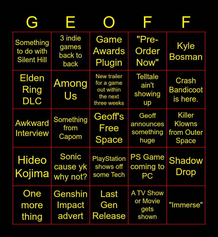 This bingo card has a free space and 34 words: Alan Wake II has Blood, A TV Show or Movie gets shown, MK 1 reveals a new Kharacter, A game I was really hoping to see does not get shown, Hideo Kojima, Among Us, Kyle Bosman, One more thing, 3 indie games back to back, Some random celebrity is there, New trailer for a game out within the next three weeks, Game Awards Plugin, Geoff shows off something cool but random, Food Delivery promo, Geoff announces something huge, Crash Bandicoot is here., Genshin Impact advert, Awkward Interview, Sonic cause yk why not?, PS Game coming to PC, PlayStation shows off some Tech, German Advert, Something to do with Silent Hill, Killer Klowns from Outer Space, Last Gen Release, "Immerse", "Pre-Order Now", Delay for a game, Telltale ain't showing up, Elden Ring DLC, Fortnite Collab, Something from Capom, Shadow Drop and "Try the demo today!".