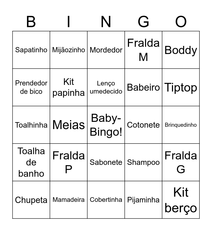 This bingo card has a free space and 24 words: Fralda P, Mamadeira, Lenço umedecido, Chupeta, Boddy, Sapatinho, Prendedor de bico, Mijãozinho, Cotonete, Sabonete, Babeiro, Toalhinha, Shampoo, Fralda G, Kit papinha, Pijaminha, Brinquedinho, Mordedor, Tiptop, Meias, Kit berço, Toalha de banho, Fralda M and Cobertinha.
