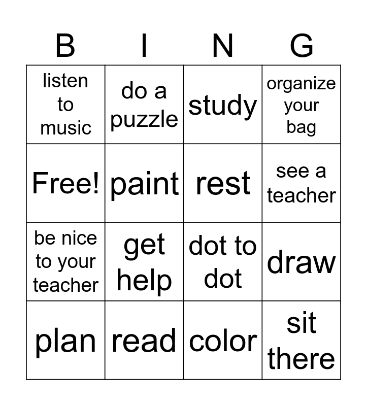 This bingo card has 16 words: read, draw, study, listen to music, be nice to your teacher, do a puzzle, dot to dot, color, Free!, paint, plan, organize your bag, get help, see a teacher, rest and sit there.