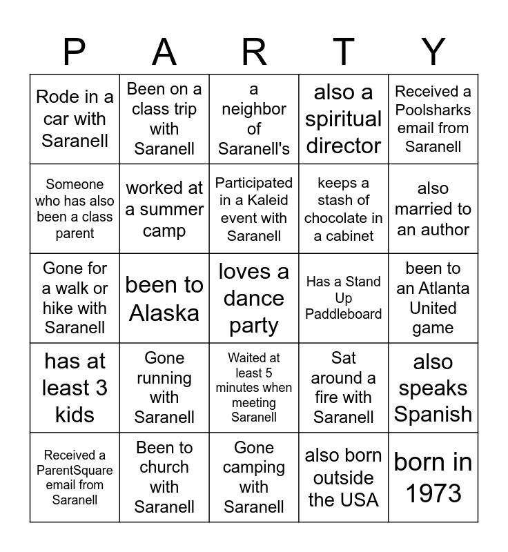 This bingo card has a free space and 24 words: Gone running with Saranell, Been to church with Saranell, Participated in a Kaleid event with Saranell, Received a ParentSquare email from Saranell, Received a Poolsharks email from Saranell, Rode in a car with Saranell, Someone who has also been a class parent, Been on a class trip with Saranell, Has a Stand Up Paddleboard, Waited at least 5 minutes when meeting Saranell, keeps a stash of chocolate in a cabinet, Gone for a walk or hike with Saranell, Sat around a fire with Saranell, also speaks Spanish, worked at a summer camp, also born outside the USA, been to an Atlanta United game, a neighbor of Saranell's, also married to an author, been to Alaska, born in 1973, has at least 3 kids, also a spiritual director and Gone camping with Saranell.