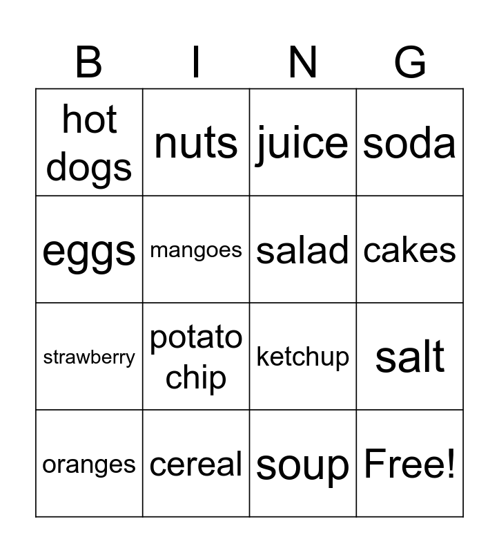 This bingo card has 23 words: Free!, burgers, cakes, cookies, eggs, hot dogs, mangoes, nuts, oranges, pineapple, potato chip, strawberry, tomato, butter, cereal, ham, juice, ketchup, salad, salt, soda, soup and sugar.