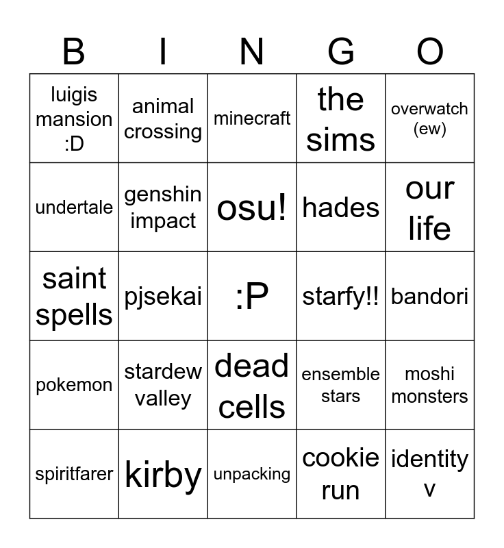 This bingo card has a free space and 24 words: stardew valley, kirby, osu!, spiritfarer, overwatch (ew), luigis mansion :D, undertale, animal crossing, starfy!!, dead cells, hades, saint spells, ensemble stars, moshi monsters, genshin impact, cookie run, bandori, minecraft, our life, pjsekai, identity v, pokemon, the sims and unpacking.