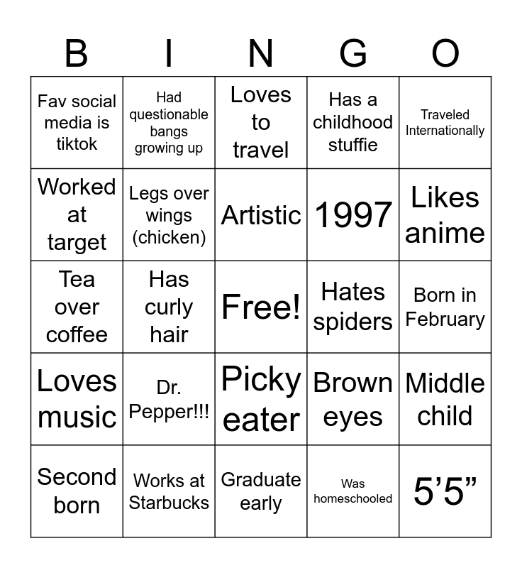 This bingo card has a free space and 29 words: Second born, Likes cats more than dogs, Has curly hair, Has a tattoo, Fav social media is tiktok, Loves to travel, Legs over wings (chicken), Dr. Pepper!!!, Hates spiders, Works at Starbucks, Born in February, 5’5”, Graduate early, Was homeschooled, Likes anime, Likes miniatures, Picky eater, Loves music, Traveled Internationally, Tea over coffee, Brown eyes, Pierced!!, 1997, Worked at target, Has a childhood stuffie, Had questionable bangs growing up, Middle child, Artistic and Concerts!!!.