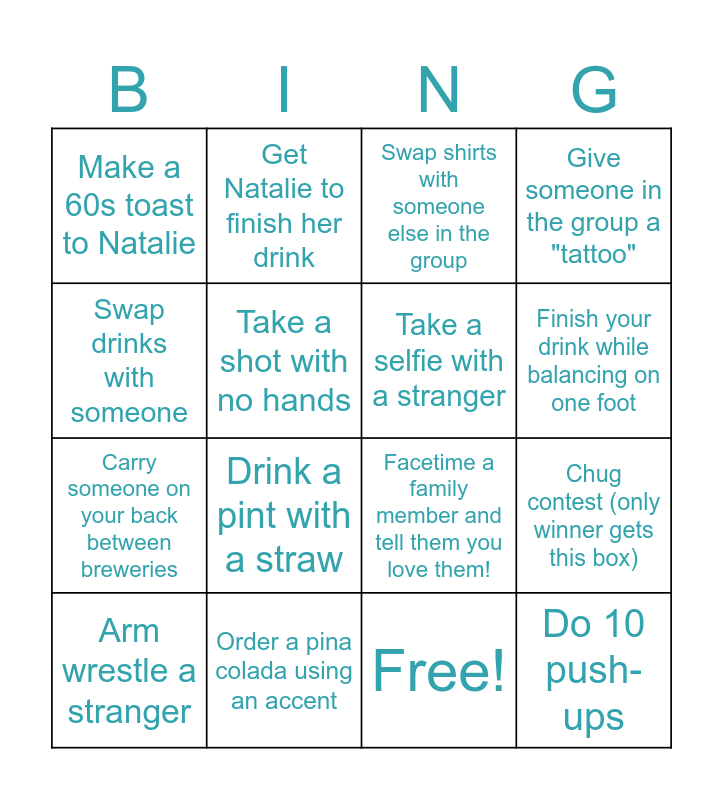 This bingo card has 16 words: Order a pina colada using an accent, Chug contest (only winner gets this box), Swap shirts with someone else in the group, Make a 60s toast to Natalie, Carry someone on your back between breweries, Get Natalie to finish her drink, Facetime a family member and tell them you love them!, Free!, Swap drinks with someone, Take a shot with no hands, Arm wrestle a stranger, Give someone in the group a "tattoo", Drink a pint with a straw, Finish your drink while balancing on one foot, Take a selfie with a stranger and Do 10 push-ups.