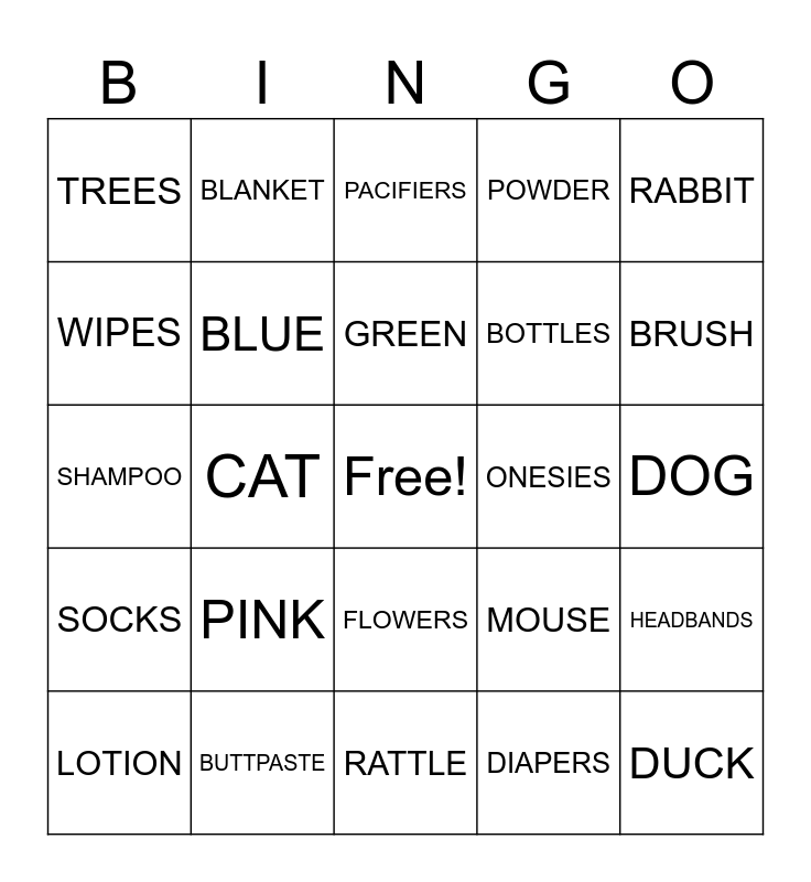 This bingo card has a free space and 28 words: HEADBANDS, BIBS, BOTTLES, DIAPERS, WIPES, PACIFIERS, BLANKET, SOCKS, ONESIES, LOTION, SHAMPOO, POWDER, BUTTPASTE, RATTLE, BRUSH, YELLOW, PINK, BLUE, GREEN, FLOWERS, TREES, BEAR, DUCK, CAT, DOG, MOUSE, RABBIT and GIRAFFE.
