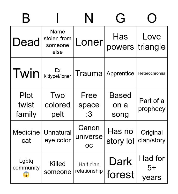 This bingo card has a free space and 24 words: Unnatural eye color, Killed someone, Trauma, Lgbtq community 😱, Love triangle, Dead, Twin, Name stolen from someone else, Based on a song, Canon universe oc, Apprentice, Plot twist family, Has no story lol, Original clan/story, Ex kittypet/loner, Dark forest, Part of a prophecy, Loner, Heterochromia, Two colored pelt, Had for 5+ years, Medicine cat, Has powers and Half clan relationship.