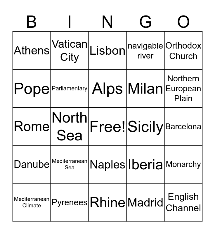 This bingo card has a free space and 24 words: Mediterranean Sea, Pyrenees, Alps, Mediterranean Climate, Orthodox Church, Athens, Pope, Vatican City, Sicily, Naples, Milan, Rome, Iberia, Monarchy, Parliamentary, Madrid, Barcelona, Lisbon, Northern European Plain, North Sea, English Channel, Danube, navigable river and Rhine.
