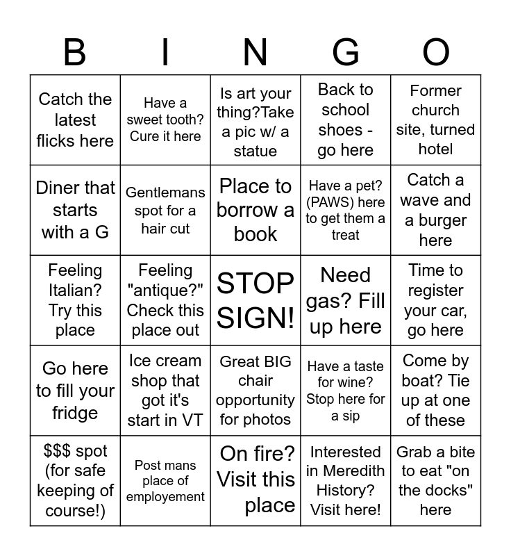 This bingo card has a free space and 24 words: Ice cream shop that got it's start in VT, Post mans place of employement, Place to borrow a book, $$$ spot (for safe keeping of course!), Former church site, turned hotel, Catch the latest flicks here, Diner that starts with a G, Have a sweet tooth? Cure it here, Need gas? Fill up here, Great BIG chair opportunity for photos, Have a pet? (PAWS) here to get them a treat, Feeling Italian? Try this place, Have a taste for wine? Stop here for a sip, Come by boat? Tie up at one of these, Gentlemans spot for a hair cut, Interested in Meredith History? Visit here!, Time to register your car, go here, Is art your thing?Take a pic w/ a statue, Catch a wave and a burger here, Feeling "antique?" Check this place out, Grab a bite to eat "on the docks" here, Go here to fill your fridge, Back to school shoes - go here and On fire?Visit this place.