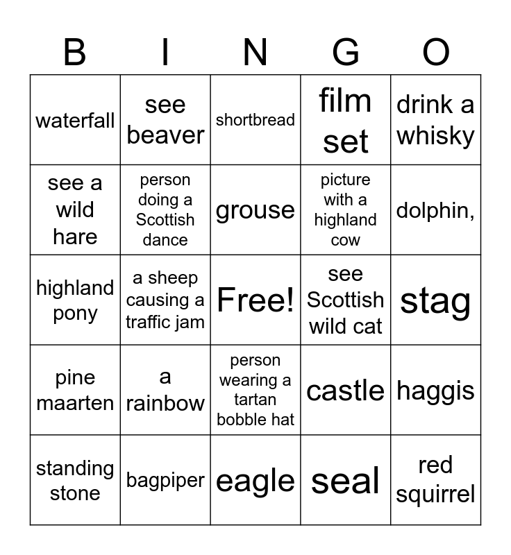 This bingo card has a free space and 24 words: a rainbow, bagpiper, grouse, standing stone, drink a whisky, waterfall, see a wild hare, see beaver, see Scottish wild cat, person wearing a tartan bobble hat, picture with a highland cow, highland pony, castle, haggis, person doing a Scottish dance, seal, stag, shortbread, dolphin,, a sheep causing a traffic jam, red squirrel, pine maarten, film set and eagle.