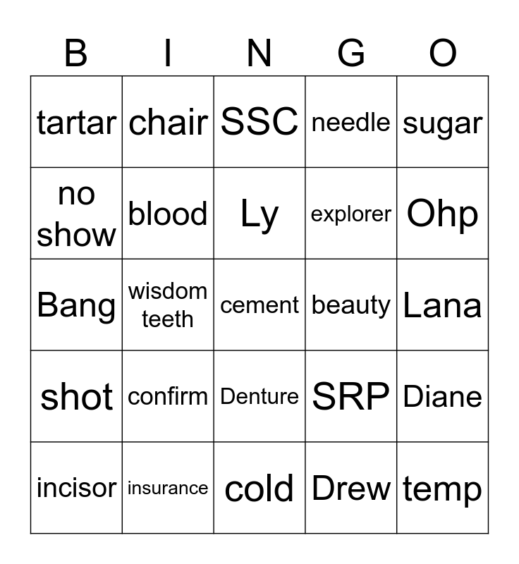 This bingo card has 86 words: Free!, Filling, Denture, Build up, crown, bridge, Tommy, Alvin, My, Hau, Mike, Mai, Diane, Lana, Ariel, Ly, Lan, Chrisitne, Van, Cameron, Khiem, Grace, Bang, Chau, Drew, Debbie, Tram, Nathan, billing, code, insurance, cash, late, confirm, no show, referral, Ohp, baby teeth, adult teeth, wisdom teeth, no teeth, smile, cry, beauty, candy, sugar, payment, chair, computer, implant, denture, impression, shot, bite, gauze, cotton tolls, forcep, explorer, needle, blood, tartar, stains, composite, amalgam, gold, SSC, injection, cement, temp, resin, teeth, molar, incisor, canine, pain, hot, cold, broken, cavity, numb, tongue, gum, healthy, disease, SRP and RCT.