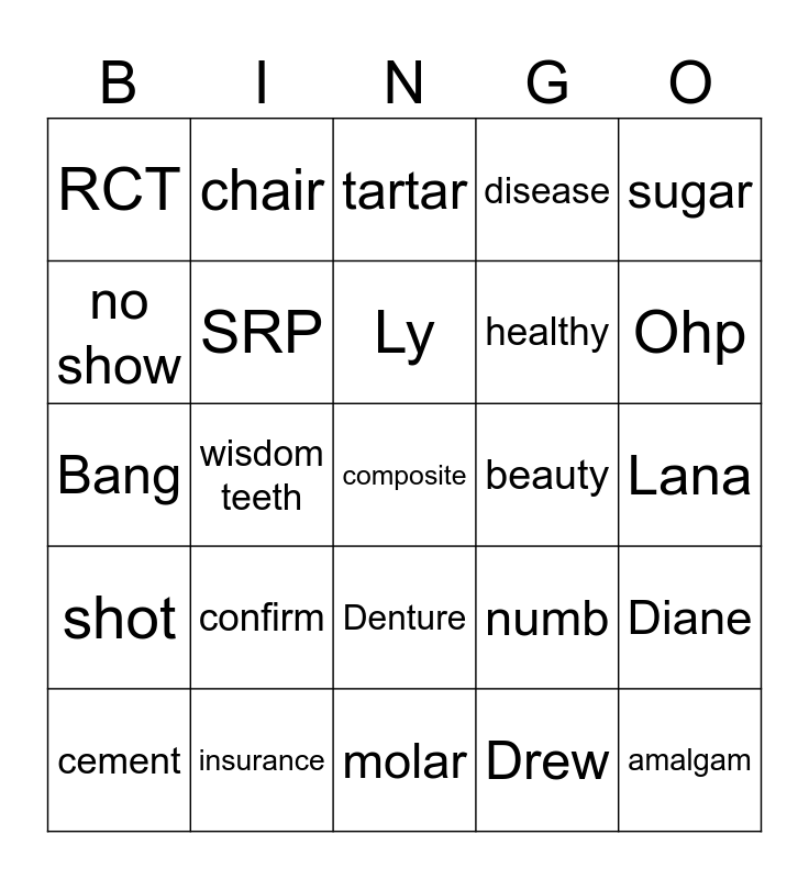 This bingo card has 86 words: Free!, Filling, Denture, Build up, crown, bridge, Tommy, Alvin, My, Hau, Mike, Mai, Diane, Lana, Ariel, Ly, Lan, Chrisitne, Van, Cameron, Khiem, Grace, Bang, Chau, Drew, Debbie, Tram, Nathan, billing, code, insurance, cash, late, confirm, no show, referral, Ohp, baby teeth, adult teeth, wisdom teeth, no teeth, smile, cry, beauty, candy, sugar, payment, chair, computer, implant, denture, impression, shot, bite, gauze, cotton tolls, gum, healthy, disease, SRP, RCT, forcep, explorer, needle, blood, tartar, stains, composite, amalgam, gold, SSC, injection, cement, temp, resin, teeth, molar, incisor, canine, pain, hot, cold, broken, cavity, numb and tongue.