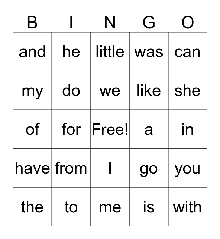 This bingo card has a free space and 24 words: from, to, we, the, can, and, my, he, a, I, like, of, go, you, do, is, in, little, she, for, with, have, was and me.