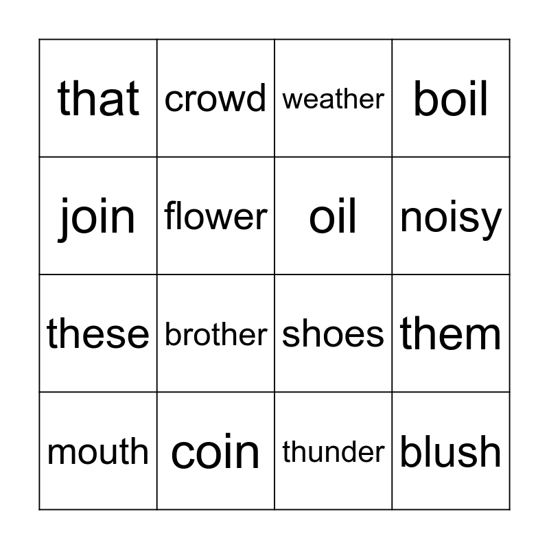 This bingo card has 50 words: cow, mouth, power, brown, towel, crown, crowd, flour, flower, bow, oil, boil, point, toy, annoy, choice, noisy, coin, destroy, join, them, this, that, these, those, mother, brother, gather, weather, there, three, think, third, thigh, thirsty, Thursday, throat, teeth, bathtub, thunder, child, catch, beach, chair, touch, shoes, share, shampoo, blush and fish.