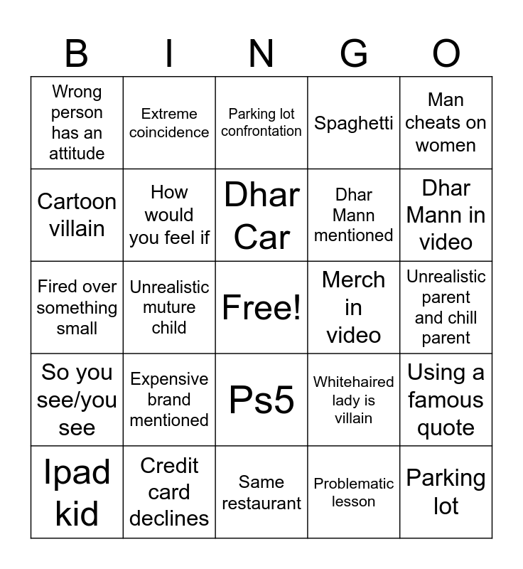 This bingo card has a free space and 39 words: Racism, Sexism, Rich people hate on poor, How would you feel if, Ipad kid, Ps5, Dhar Car, Women cheats on man, Man cheats on women, So you see/you see, Unrealistic muture child, Spaghetti, Parking lot, Unrealistic parent and chill parent, Merch in video, Expensive brand mentioned, Random celebrity, Wrong person has an attitude, Jarvis predicts story plot, Whitehaired lady is villain, Cartoon villain, Same restaurant, Dhar Mann mentioned, Dhar Mann in video, Dhar Mann voice over, Inappropriate music, Flashback, Timelapse, Names that are too on the nose, Extreme coincidence, Secretly Rich, Bad greenscreen, Parking lot confrontation, Credit card declines, Problematic lesson, Dhar Mann studios in video, Using a famous quote, Fired over something small and Creep behavior.