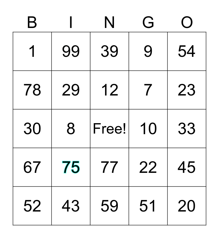 This bingo card has a free space and 24 words: 75, 43, 12, 52, 54, 1, 78, 99, 10, 77, 7, 30, 22, 45, 29, 51, 33, 39, 23, 8, 20, 67, 9 and 59.
