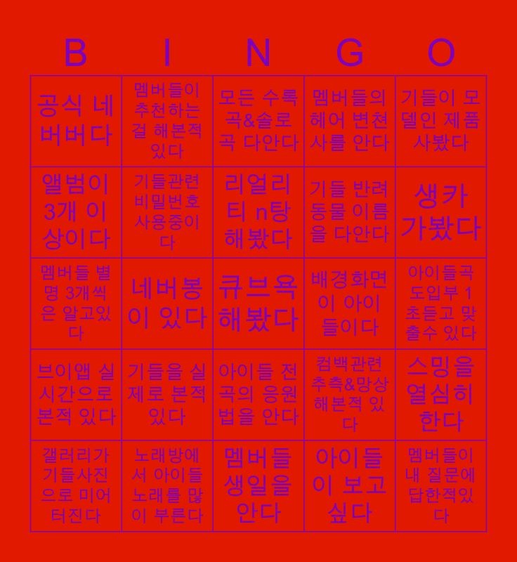 This bingo card has 25 words: 기들을 실제로 본적 있다, 멤버들 생일을 안다, 리얼리티 n탕 해봤다, 갤러리가 기들사진으로 미어터진다, 기들이 모델인 제품 사봤다, 공식 네버버다, 앨범이 3개 이상이다, 멤버들이 추천하는걸 해본적있다, 배경화면이 아이들이다, 아이들 전곡의 응원법을 안다, 기들 반려동물 이름을 다안다, 멤버들 별명 3개씩은 알고있다, 컴백관련 추측&망상 해본적 있다, 스밍을 열심히 한다, 기들관련 비밀번호 사용중이다, 멤버들이 내 질문에 답한적있다, 아이들곡 도입부 1초듣고 맞출수 있다, 모든 수록곡&솔로곡 다안다, 생카 가봤다, 네버봉이 있다, 큐브욕 해봤다, 노래방에서 아이들 노래를 많이 부른다, 브이앱 실시간으로 본적 있다, 멤버들의 헤어 변쳔사를 안다 and 아이들이 보고싶다.