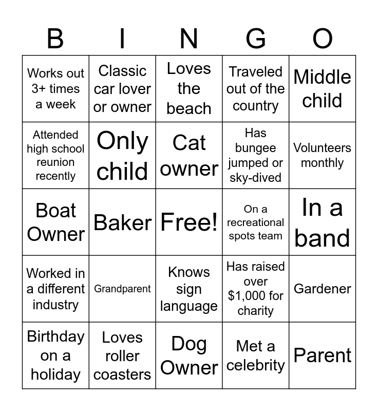 This bingo card has a free space and 24 words: Grandparent, Loves roller coasters, Cat owner, Birthday on a holiday, Middle child, Works out 3+ times a week, Attended high school reunion recently, Classic car lover or owner, On a recreational spots team, Knows sign language, Has bungee jumped or sky-dived, Boat Owner, Has raised over $1,000 for charity, Gardener, Only child, Met a celebrity, In a band, Loves the beach, Volunteers monthly, Baker, Parent, Worked in a different industry, Traveled out of the country and Dog Owner.