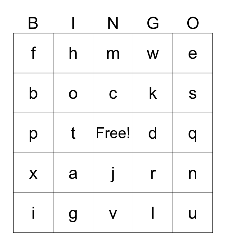 This bingo card has a free space and 24 words: a, g, c, i, e, f, b, h, d, j, k, p, r, n, o, l, q, m, s, t, u, x, w and v.
