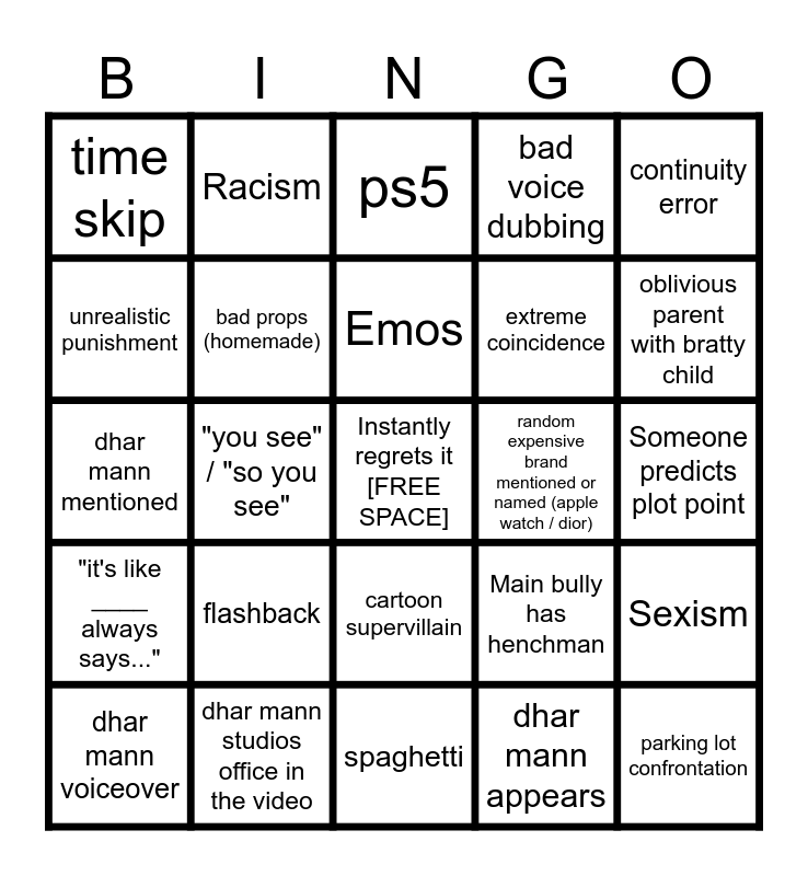 This bingo card has a free space and 29 words: dhar mann voiceover, dhar car, "you see" / "so you see", merch in video, time skip, ps5, bad props (homemade), flashback, random expensive brand mentioned or named (apple watch / dior), dhar mann studios office in the video, Someone predicts plot point, parking lot confrontation, spaghetti, dhar mann appears, oblivious parent with bratty child, kids with ipad, cartoon supervillain, "it's like ____ always says...", continuity error, dhar mann mentioned, Main bully has henchman, someone fired over something small, extreme coincidence, unrealistic punishment, bad voice dubbing, Racism, Sexism, Emos and Anime.