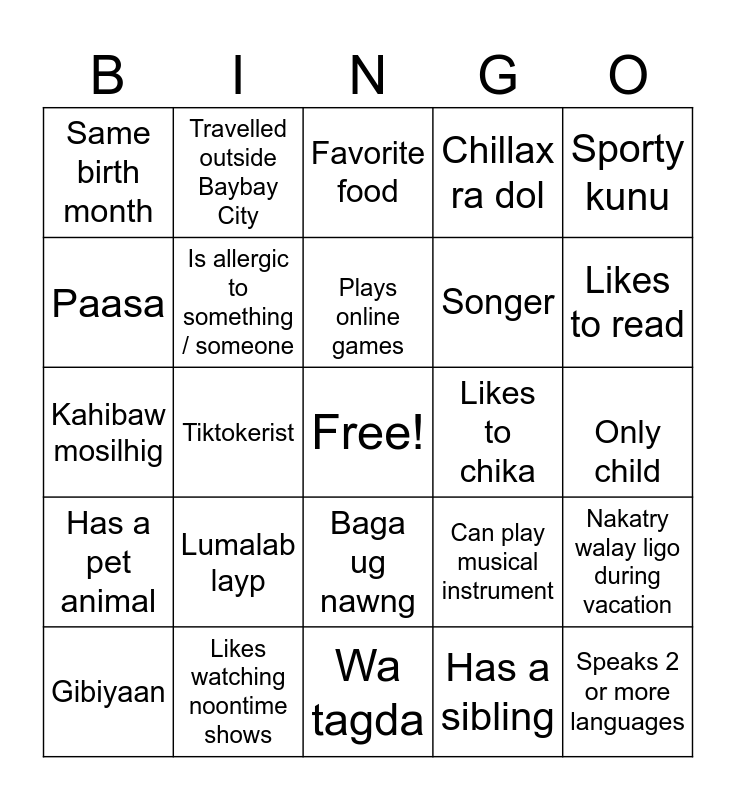 This bingo card has a free space and 24 words: Lumalab layp, Likes watching noontime shows, Plays online games, Gibiyaan, Sporty kunu, Same birth month, Paasa, Travelled outside Baybay City, Likes to chika, Baga ug nawng, Songer, Kahibaw mosilhig, Can play musical instrument, Nakatry walay ligo during vacation, Is allergic to something / someone, Has a sibling, Only child, Favorite food, Likes to read, Tiktokerist, Speaks 2 or more languages, Has a pet animal, Chillax ra dol and Wa tagda.