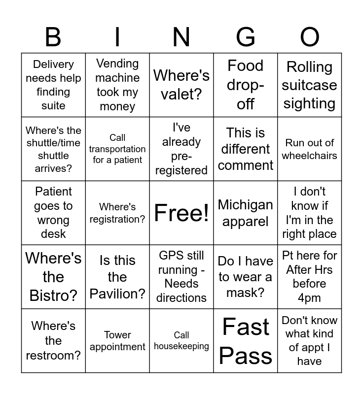 This bingo card has a free space and 24 words: Is this the Pavilion?, Tower appointment, I've already pre-registered, Where's the restroom?, Rolling suitcase sighting, Delivery needs help finding suite, Where's the shuttle/time shuttle arrives?, Vending machine took my money, Michigan apparel, GPS still running - Needs directions, This is different comment, Patient goes to wrong desk, Do I have to wear a mask?, Pt here for After Hrs before 4pm, Call transportation for a patient, Fast Pass, I don't know if I'm in the right place, Where's valet?, Run out of wheelchairs, Where's registration?, Don't know what kind of appt I have, Where's the Bistro?, Food drop-off and Call housekeeping.