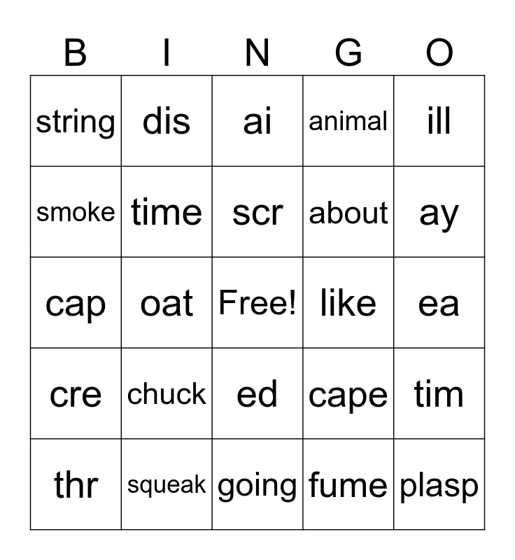 This bingo card has a free space and 24 words: chuck, squeak, scr, thr, ill, string, smoke, dis, like, ed, about, cap, cape, tim, time, fume, ea, ai, ay, oat, plasp, cre, animal and going.