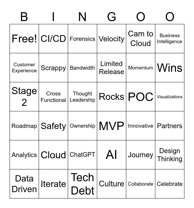 This bingo card has 36 words: AI, ChatGPT, Culture, Customer Experience, Roadmap, Rocks, Scrappy, Tech Debt, Cam to Cloud, Journey, Wins, Velocity, Design Thinking, Cross Functional, Limited Release, Free!, Analytics, POC, Stage 2, Forensics, Thought Leadership, Safety, MVP, Ownership, Innovative, CI/CD, Momentum, Iterate, Bandwidth, Business Intelligence, Celebrate, Data Driven, Partners, Visualizations, Cloud and Collaborate.