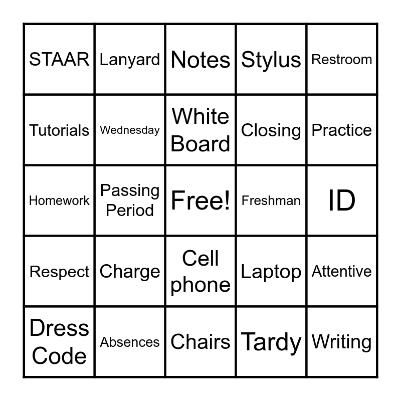 This bingo card has a free space and 32 words: Tardy, Kind, Passing Period, Desmos, Respect, Wednesday, Restroom, Attentive, Lanyard, Work, White Board, Notes, Formative, Warm Up, Freshman, AP, Dress Code, Homework, Cell phone, Charge, Laptop, One, ID, Absences, Writing, Stylus, Closing, Tutorials, STAAR, Chairs, Door and Practice.