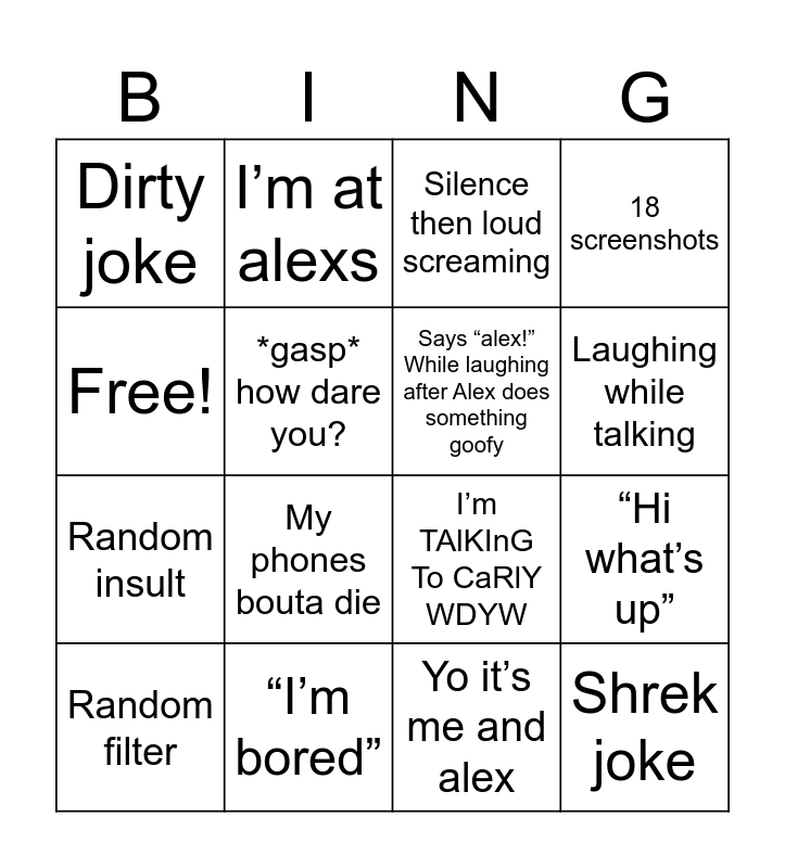 This bingo card has 16 words: “I’m bored”, “Hi what’s up”, Silence then loud screaming, Dirty joke, Random insult, I’m at alexs, I’m TAlKInG To CaRlY WDYW, Yo it’s me and alex, Free!, *gasp* how dare you?, Random filter, 18 screenshots, My phones bouta die, Laughing while talking, Says “alex!” While laughing after Alex does something goofy and Shrek joke.