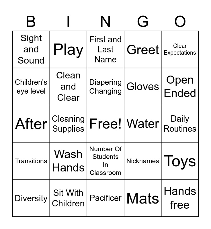 This bingo card has a free space and 24 words: Wash Hands, Sit With Children, Diapering Changing, Diversity, Clear Expectations, Sight and Sound, Children's eye level, Play, Water, Number Of Students In Classroom, Gloves, After, Nicknames, Toys, Clean and Clear, Mats, Daily Routines, First and Last Name, Open Ended, Cleaning Supplies, Hands free, Transitions, Greet and Pacificer.