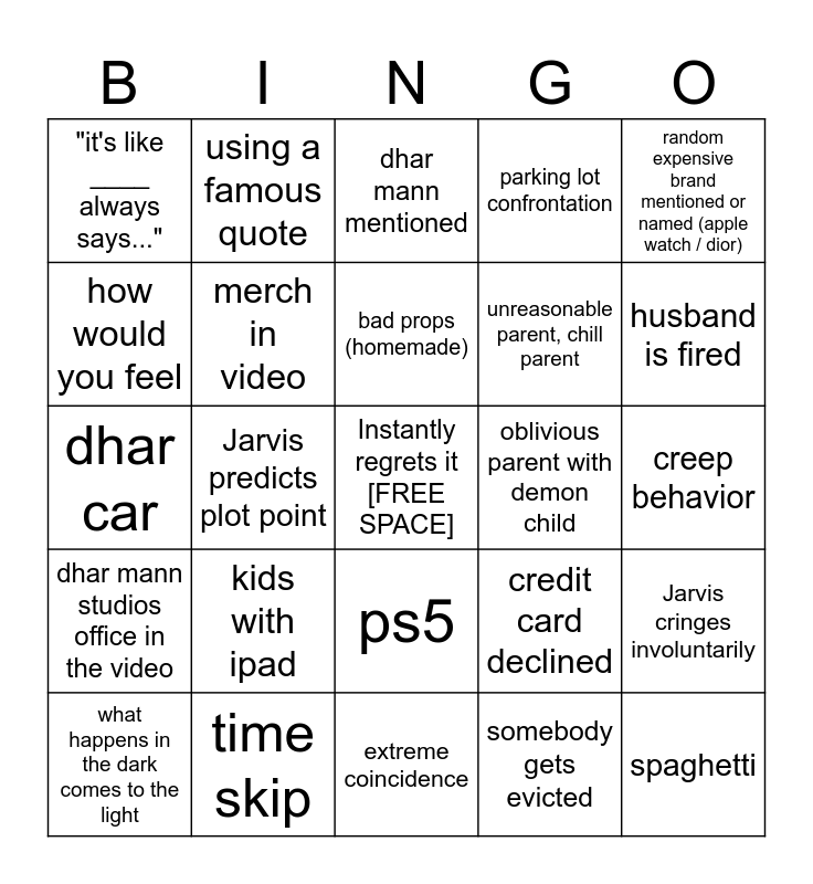 This bingo card has a free space and 41 words: dhar mann voiceover, dhar car, "you see" / "so you see", merch in video, time skip, ps5, bad props (homemade), flashback, random expensive brand mentioned or named (apple watch / dior), dhar mann studios office in the video, Jarvis predicts plot point, parking lot confrontation, spaghetti, creep behavior, oblivious parent with demon child, kids with ipad, cartoon supervillain, "it's like ____ always says...", continuity error, dhar mann mentioned, Jarvis cringes involuntarily, someone fired over something small, extreme coincidence, unreasonable parent, chill parent, bad voice dubbing, racist or sexist, somebody gets evicted, names to on the nose, husband is fired, inappropriate music, child with unrealistic emotional maturity, using a famous quote, what happens in the dark comes to the light, secretly rich, credit card declined, how would you feel, bad greenscreen, unreasonable calm and forgiving, random celeb, problematic lesson and clearly the wrong person has an attitude.