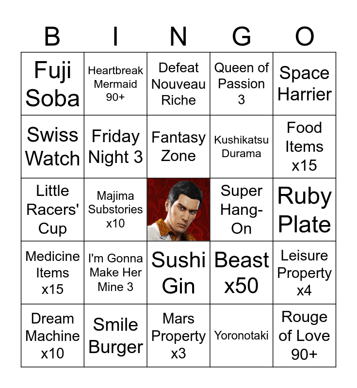 This bingo card has a free space and 24 words: I'm Gonna Make Her Mine 3, Smile Burger, Fantasy Zone, Dream Machine x10, Space Harrier, Fuji Soba, Swiss Watch, Heartbreak Mermaid 90+, Super Hang-On, Sushi Gin, Kushikatsu Durama, Little Racers' Cup, Beast x50, Leisure Property x4, Friday Night 3, Yoronotaki, Ruby Plate, Defeat Nouveau Riche, Food Items x15, Majima Substories x10, Rouge of Love 90+, Medicine Items x15, Queen of Passion 3 and Mars Property x3.