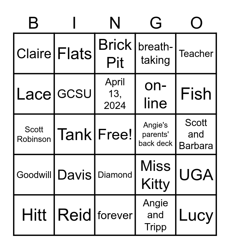 This bingo card has a free space and 24 words: Davis, Reid, April 13, 2024, Hitt, Teacher, Claire, Lace, Flats, Angie's parents' back deck, Diamond, on-line, Scott Robinson, Miss Kitty, UGA, GCSU, Angie and Tripp, Scott and Barbara, Brick Pit, Fish, Tank, Lucy, Goodwill, breath-taking and forever.