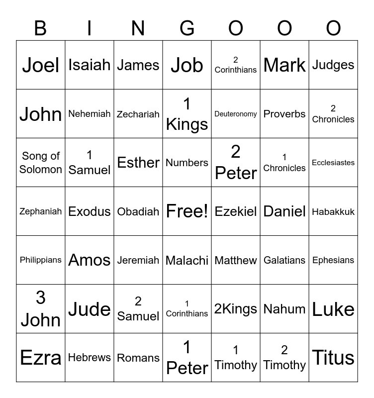 This bingo card has a free space and 66 words: Genesis, Exodus, Leviticus, Numbers, Deuteronomy, Joshua, Judges, Ruth, 1 Samuel, 2 Samuel, 1 Kings, 2Kings, 1 Chronicles, 2 Chronicles, Ezra, Nehemiah, Esther, Job, Pslam, Proverbs, Ecclesiastes, Song of Solomon, Isaiah, Jeremiah, Lamentations, Ezekiel, Daniel, Hosea, Joel, Amos, Obadiah, Jonah, Micah, Nahum, Habakkuk, Zephaniah, Haggai, Zechariah, Malachi, Matthew, Mark, Luke, John, Acts, Romans, 1 Corinthians, 2 Corinthians, Galatians, Ephesians, Philippians, Colossians, 1 Thessalonians, 2 Thessalonians, 1 Timothy, 2 Timothy, Titus, Philemon, Hebrews, James, 1 Peter, 2 Peter, 1 John, 2 John, 3 John, Jude and Revelation.