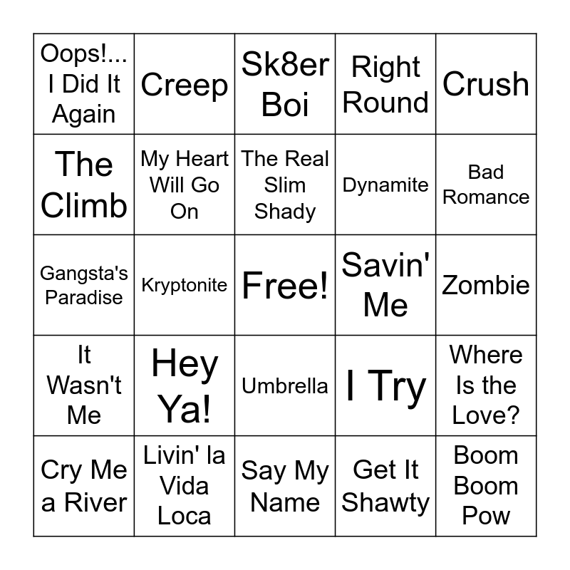 This bingo card has a free space and 24 words: Hey Ya!, Livin' la Vida Loca, The Real Slim Shady, Cry Me a River, Crush, Oops!... I Did It Again, The Climb, Creep, Savin' Me, Umbrella, Dynamite, Gangsta's Paradise, I Try, Where Is the Love?, My Heart Will Go On, Get It Shawty, Zombie, Sk8er Boi, Bad Romance, Kryptonite, Boom Boom Pow, It Wasn't Me, Right Round and Say My Name.