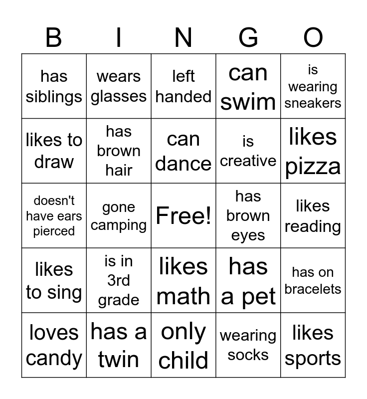 This bingo card has a free space and 24 words: is in 3rd grade, has a twin, can dance, loves candy, is wearing sneakers, has siblings, likes to draw, wears glasses, has brown eyes, likes math, is creative, doesn't have ears pierced, has a pet, has on bracelets, has brown hair, wearing socks, likes reading, left handed, likes pizza, gone camping, likes sports, likes to sing, can swim and only child.
