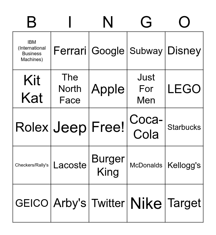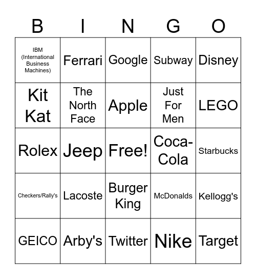 This bingo card has a free space and 24 words: Lacoste, Arby's, Apple, GEICO, Disney, IBM (International Business Machines), Kit Kat, Ferrari, Coca-Cola, Burger King, Just For Men, Rolex, McDonalds, Kellogg's, The North Face, Nike, Starbucks, Google, LEGO, Jeep, Target, Checkers/Rally's, Subway and Twitter.