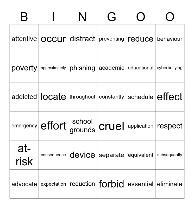 This bingo card has 36 words: separate, device, forbid, poverty, emergency, constantly, approximately, reduction, reduce, equivalent, cyberbullying, preventing, subsequently, locate, academic, attentive, at-risk, schedule, addicted, distract, throughout, effort, cruel, school grounds, application, occur, educational, expectation, phishing, behaviour, eliminate, advocate, respect, effect, consequence and essential.