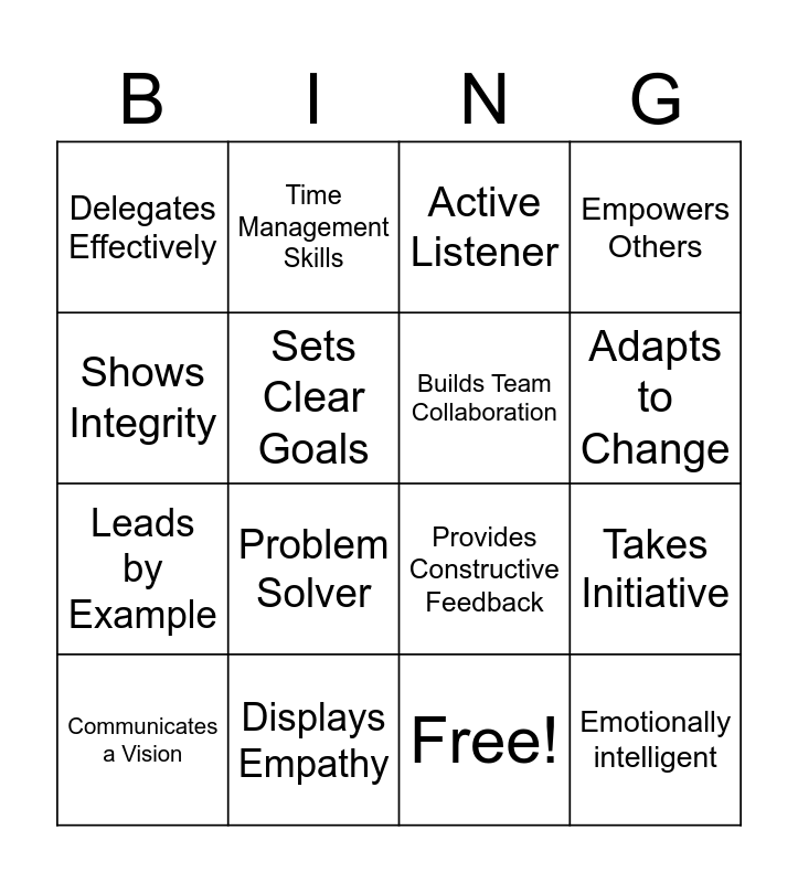 This bingo card has 17 words: Free!, Communicates a Vision, Active Listener, Delegates Effectively, Problem Solver, Empowers Others, Takes Initiative, Builds Team Collaboration, Adapts to Change, Sets Clear Goals, Displays Empathy, Provides Constructive Feedback, Shows Integrity, Time Management Skills, Leads by Example, Inspires Others and Emotionally intelligent.