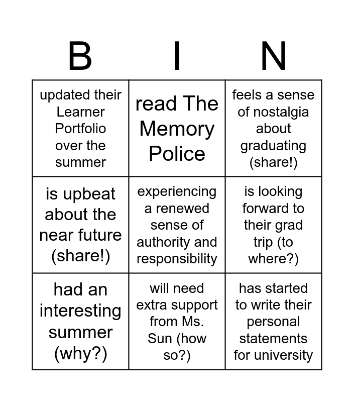 This bingo card has a free space and 8 words: is looking forward to their grad trip (to where?), feels a sense of nostalgia about graduating (share!), read The Memory Police, had an interesting summer (why?), updated their Learner Portfolio over the summer, has started to write their personal statements for university, is upbeat about the near future (share!) and will need extra support from Ms. Sun (how so?).