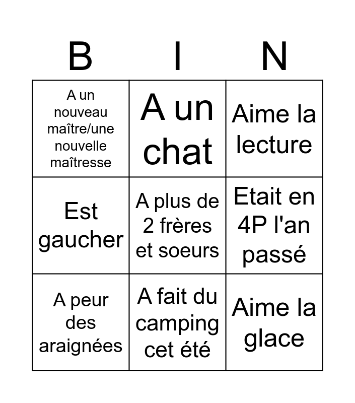 This bingo card has 12 words: Aime les mathématiques, Aime la glace, A plus de 2 frères et soeurs, Etait en 4P l'an passé, A un chat, Aime la lecture, A fait du camping cet été, Déteste les épinards, A un nouveau maître/une nouvelle maîtresse, Est gaucher, A peur des araignées and Sait ce qu'est un mammouth.