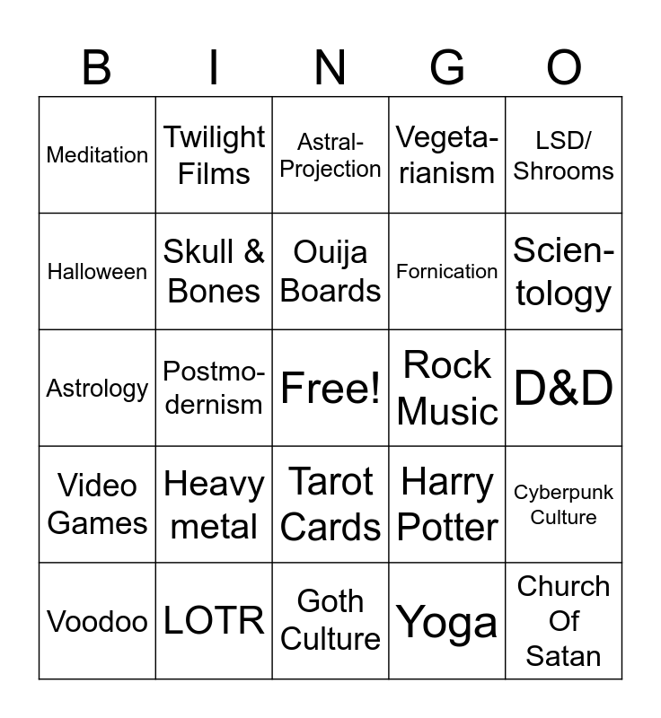 This bingo card has a free space and 24 words: Heavy metal, LOTR, Ouija Boards, Voodoo, LSD/ Shrooms, Meditation, Halloween, Twilight Films, Rock Music, Tarot Cards, Fornication, Astrology, Harry Potter, Cyberpunk Culture, Skull & Bones, Yoga, D&D, Astral- Projection, Scien-tology, Postmo-dernism, Church Of Satan, Video Games, Vegeta- rianism and Goth Culture.