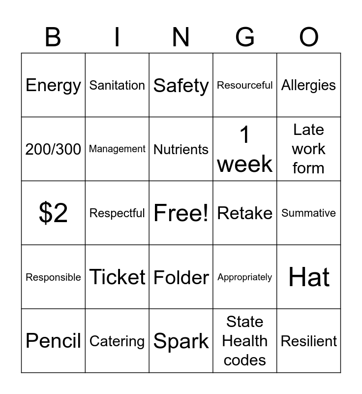 This bingo card has a free space and 39 words: Kitchen basics, Measuring, Equipment, Management, Pencil, Folder, Nutrients, Digestion, Allergies, Responsible, Respectful, Resourceful, Resilient, Summative, Retake, Ticket, After 2 weeks, Energy, Breakfast, Appropriately, 200/300, Spark, 1 week, Late work form, ELO, Break it down, Announcements, Date, Workplace, Sanitation, Career, Menu, Safety, Catering, State Health codes, Locker, Hat, $2 and Home.